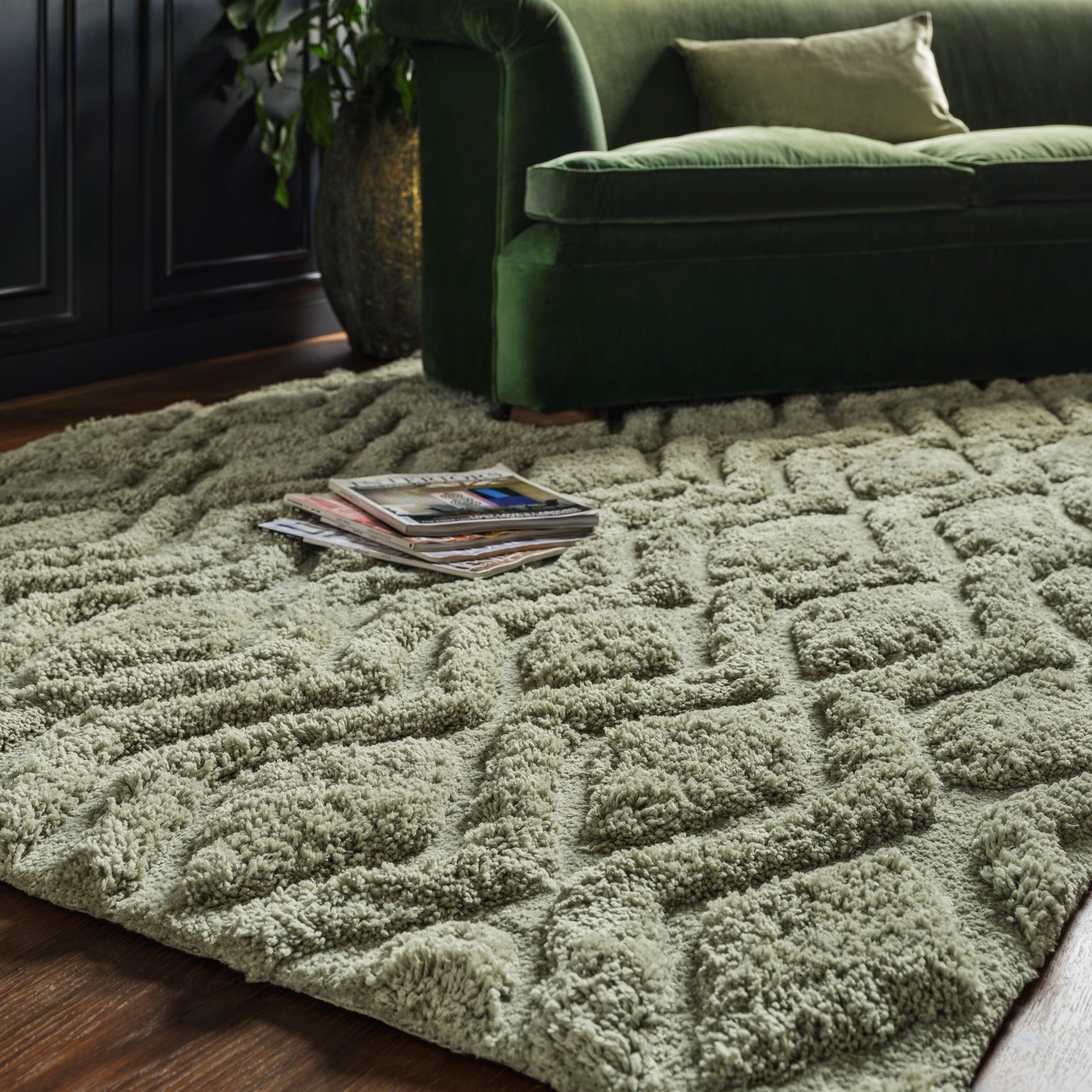 Sink deeply into the luxuriously soft shaggy pile of the Harrison rug in sage green. Its defined high low shaggy pile features a beautiful boho geometric diamond design that lends to a contemporary feel. Made from 100% polyester Harrisons thick pile is sumptuously soft to touch. Available in a range of on trend colours and sizes to suite any room and interior style.