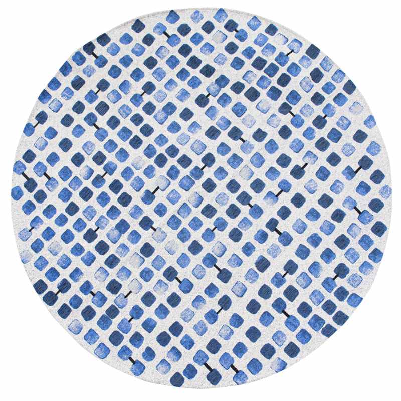Introducing the brand new Cobblestone round rug by Louis De Poortere. This rug will captivate you with its abstract shapes and artistic details. The design concept is based on in-depth graphic research, using stamps and block print techniques to create unique patterns. Gradients of blue and grey colour and varying degrees of print add depth and texture to the rug, while a subtle line links the whole together, creating visual connections that add an extra dimension to the whole. This eco-friendly rug is power loomed in Belgium and fully recyclable. The 100% Polyester pile and Anti Slip backing is both durable and resilient making it a perfect choice for under tables and chairs. Choose from two circular sizes. Also available in matching rectangular sizes click here