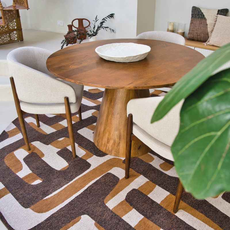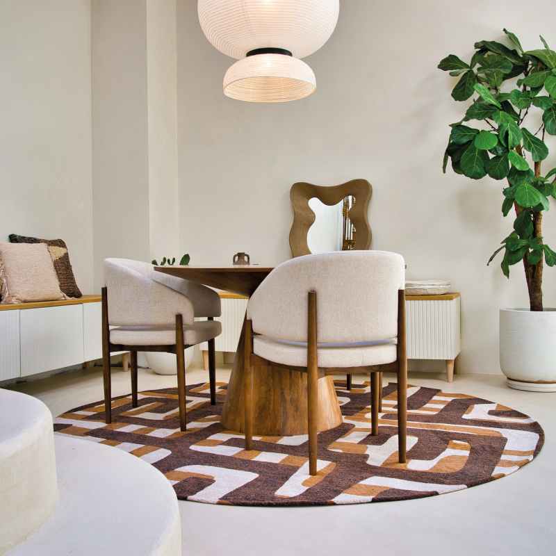 Introducing the brand new Kuba round rug by Louis De Poortere. Inspired from Zairean Kuba art, famous for its abstract motifs and rich creativity. Kuba men and women, renowned for their exceptional weaving and embroidery skills, developed increasingly abstract designs as the kingdom grew in prosperity and power. The design concept is inspired by African fabrics, but revisits them with a modern approach and a sense of added perspective. The traditional ethnic pattern is metamorphosed into two layers, creating a captivating visual depth that further enhances the effect of perspective, presented in a bison brown colourway. This eco-friendly rug is power loomed in Belgium and fully recyclable. The 100% Polyester pile and Anti Slip backing is both durable and resilient making it a perfect choice for under tables and chairs. Choose from two circular sizes. Also available in matching rectangular sizes click here