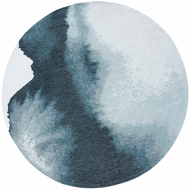 The Lagoon round rug 9332 by Louis De Poortere is based on ink blots and Rorschach tests, offering a multitude of interpretations. The design evokes the sea, earth and moss, establishing a close link with nature. The inkjet blue and white colours blend harmoniously into each other, creating a spontaneous and captivating design. This eco-friendly rug is power loomed in Belgium and fully recyclable. The 100% Polyester pile and Anti Slip backing is both durable and resilient making it a perfect choice for under tables and chairs. Choose from two circular sizes. Also available in matching rectangular sizes click here