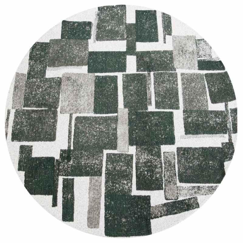 Introducing the brand new Lucia round rug 9356 by Louis De Poortere. This rug skilfully combines retro 50s elements with a trendy, contemporary aesthetic. This rug stands out for its bouclette effect, offering a soft, fluffy texture thats very much in vogue. The design concept revolves around the play of cubes and the search for balance, reminiscent of a carefully stacked house of cards. The geometric shapes are reminiscent of cubism, creating a dynamic, artistic aesthetic, presented in a sycamore green colourway. The play of transparency adds a touch of depth and mystery to the whole. This eco-friendly rug is power loomed in Belgium and fully recyclable. The 100% Polyester pile and Anti Slip backing is both durable and resilient making it a perfect choice for under tables and chairs. Also available in matching rectangular sizes click here