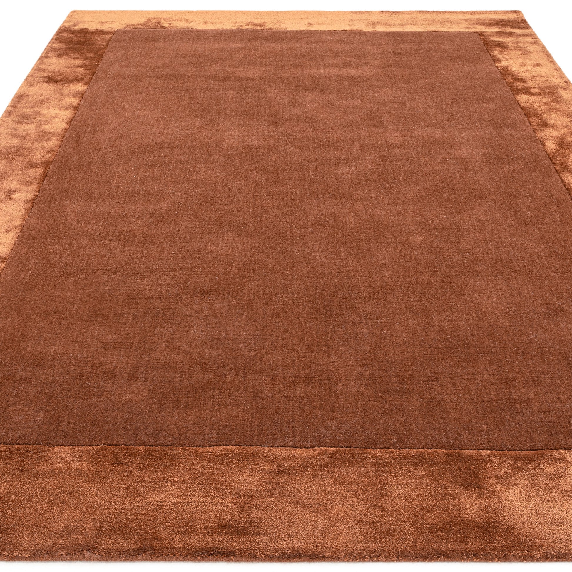Add an opulent layer to your flooring with the velvety soft Ascot rug. Hand carved to accentuate its chunky metallic border, with a soft, modest wool centre. The plain design comes in a rust brown colourway, with a shiny finish. Handmade in India using innovative weaving techniques to provide the elegant variation of textures. This classic rug is a gorgeous piece for living room, bedroom and office areas. Available in a large range of sizes from small to extra large. Composition: 65% wool 35% viscose. Pile height of 10mm.