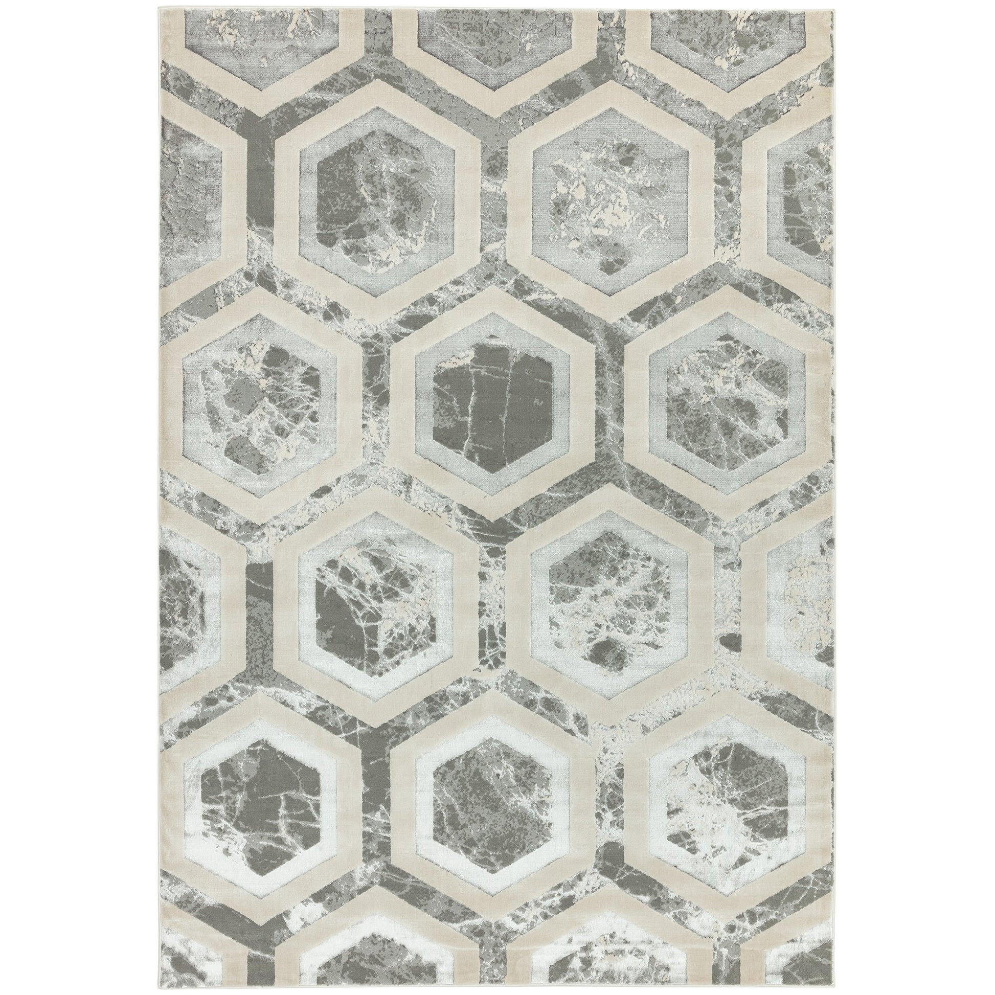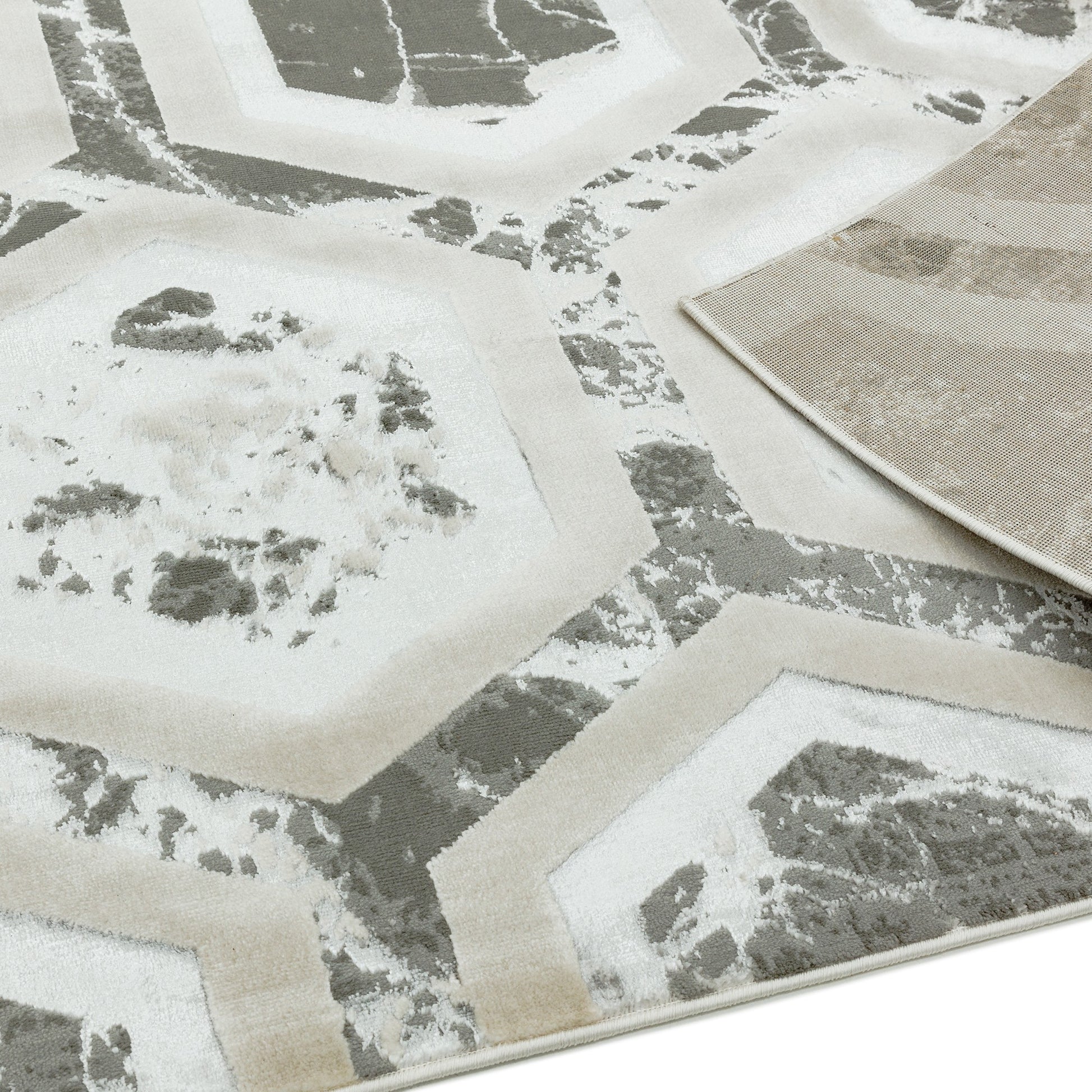 The Aurora rug offers a lustrous pile with geometric hexagon shapes in silver and beige colour tones that works wonderfully with any interior. The Crystal AU12 will create a luxurious focal point in your living room and bedroom areas. Power-loomed with a 65% polyester and 35% polypropylene yarn which benefits from being super soft, easy to clean, anti shed and very hard-wearing.