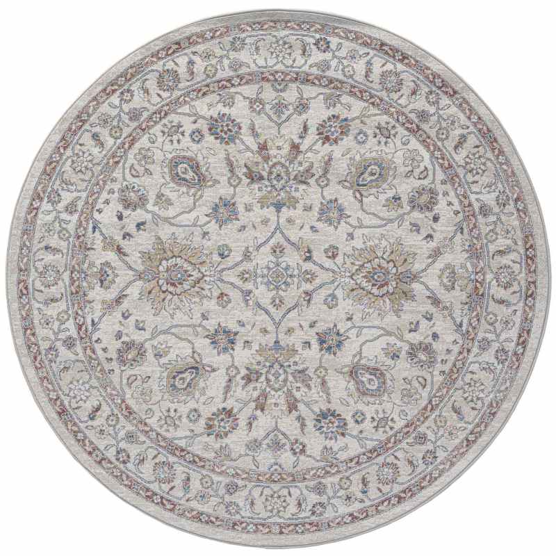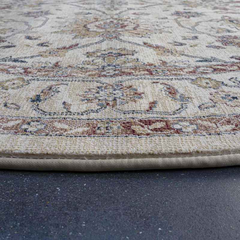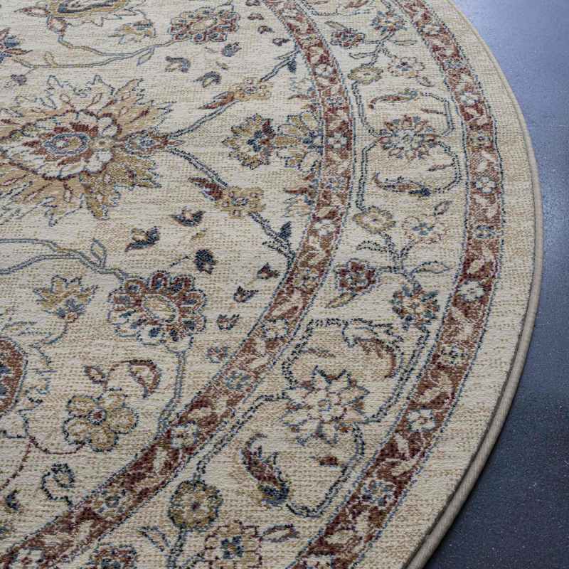 The Da Vinci 57166 circle rug is a modern approach to classical designs. Featuring a timeless Persian traditional design and intricate patterns, in shades of beige, red, brown and blue on a beige ground. Power loomed using 100% heavy heatset wilton, this high quality rug features a fine yarn from the centuries old weaving centre of Flanders, both water and fade resistant, suitable for high traffic areas. The Da Vinci rug has outstanding density, perfect for living room and bedroom areas.