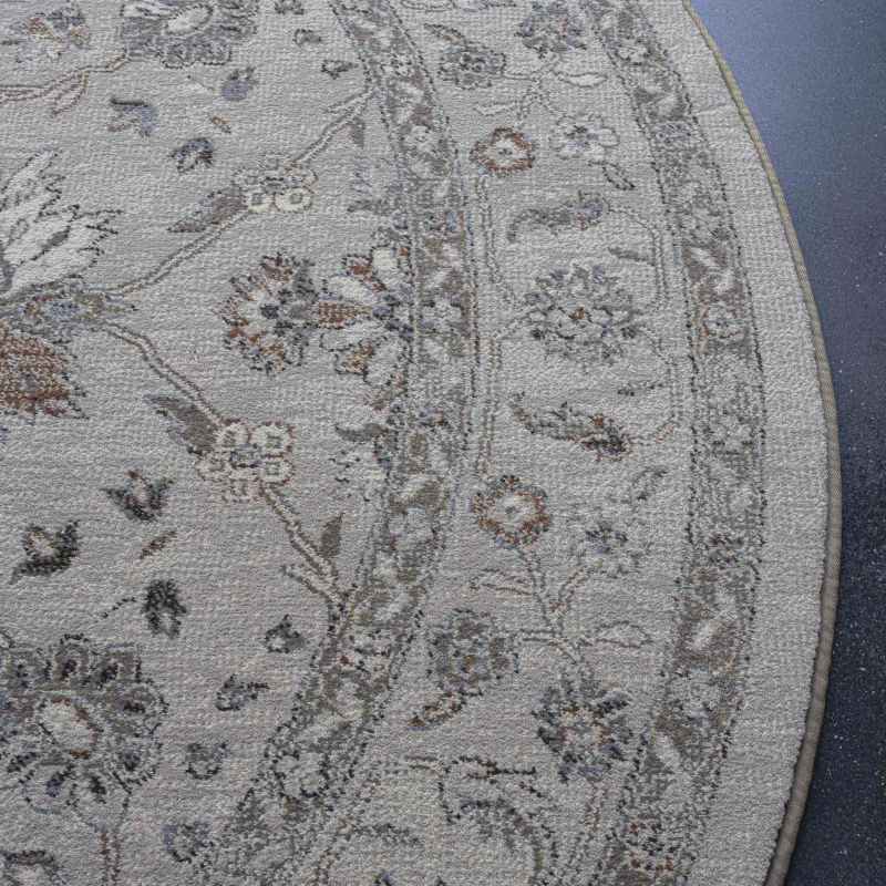 The Da Vinci 57166 circle rug is a modern approach to classical designs. Featuring a timeless Persian traditional design and intricate patterns, in shades of red, blue and brown on a taupe grey ground. Power loomed using 100% heavy heatset wilton, this high quality rug features a fine yarn from the centuries old weaving centre of Flanders, both water and fade resistant, suitable for high traffic areas. The Da Vinci rug has outstanding density, perfect for living room and bedroom areas.