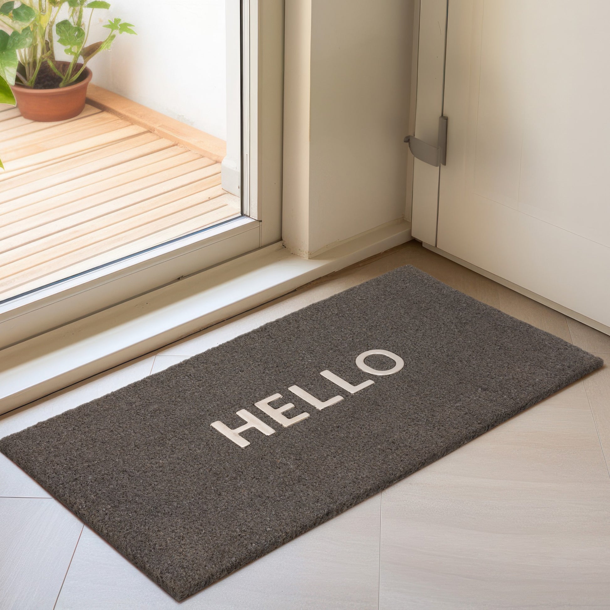 The DM01 doormat will make a lovely welcome to your home, decorating your doorstep and making everybody feel welcome. Presenting a plain design with the words Hello displayed across the middle, on a grey ground. Crafted with 100% coir to withstand daily wear and tear, ensuring long-lasting performance with added latex non-slip backing. Coir is much-loved for its durability as well as its unbeatable dirt trapping ability. Suitable for both indoor and outdoor use, weather resistant when placed in a sheltered position. Brush clean to remove any debris. Warning: Do not use on Vinyl or Linoleum Flooring. Machine woven. Table-Tufted. Pile height 20mm.