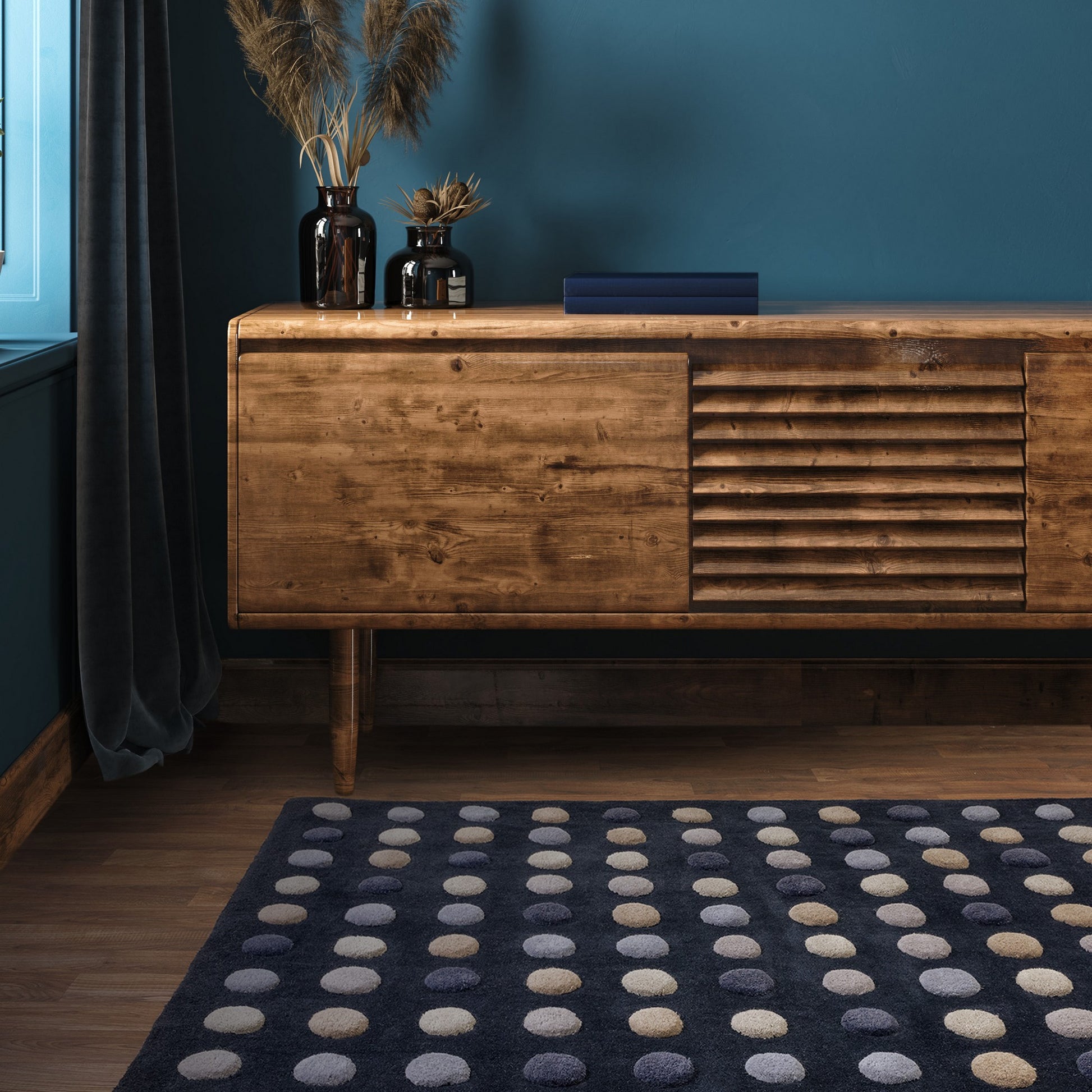 The Dotty rug in navy blue has been designed with an on-trend polka dot style and expertly hand carved in a 3D dome shape for a unique comforting underfoot feel. Each rug features 176 interspaced domes crafted with lustrous viscose yarns while the rest of the pile is crafted with wool, finished with a cotton & latex backing. Hand tufted in Indian with a high low textured pile. This modern rug is perfect for living room and bedroom areas. Pile height 9-17mm. Available in sizes small to large.