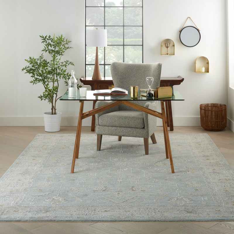 Lush, textural and elegantly understated, this traditional Persian area rug from the Infinite Collection take you back in time. This intricate Persian floral design is presented in an artfully faded palette of transitional blue tones that lend this entire collection a soft and dream-like beauty. The power-loomed, poly-blend pile has a luxurious hand feel with comforting texture. This stunning rug includes classic center medallion patterns, Persian garden patterns, and richly detailed ornamental borders. Ideal for your bedroom, living room, dining room or family room -anywhere you want a finishing touch of serene elegance.
