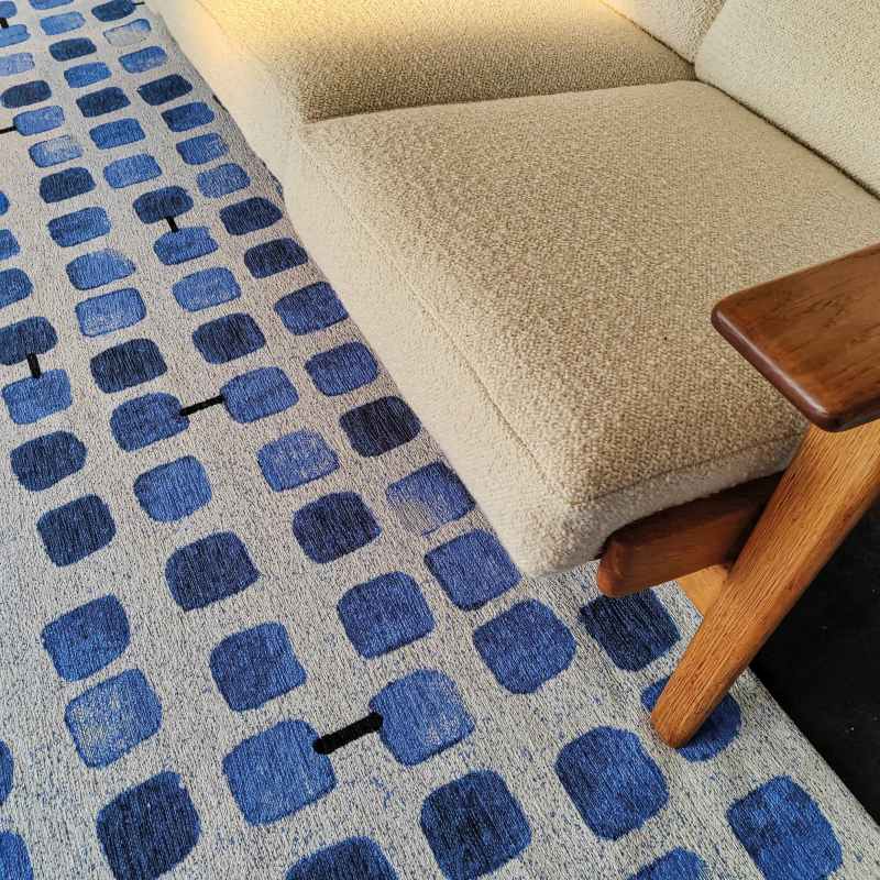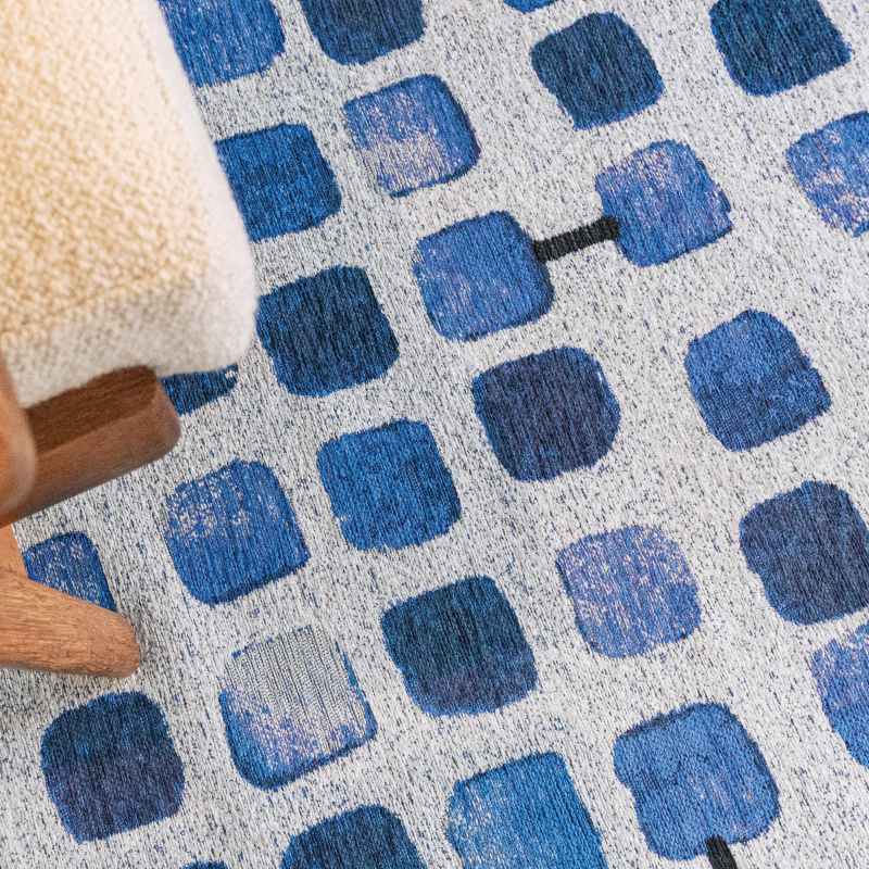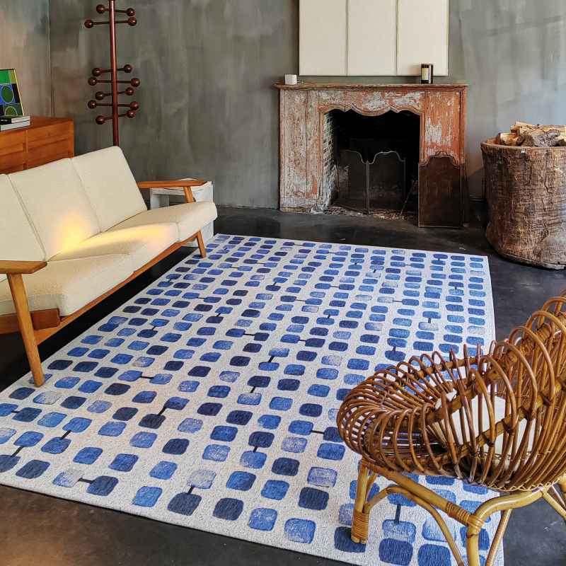 Introducing the brand new Cobblestone rug by Louis De Poortere. This rug will captivate you with its abstract shapes and artistic details. The design concept is based on in-depth graphic research, using stamps and block print techniques to create unique patterns. Gradients of blue and grey colour and varying degrees of print add depth and texture to the rug, while a subtle line links the whole together, creating visual connections that add an extra dimension to the whole. This eco-friendly rug is power loomed in Belgium and fully recyclable. The 100% Polyester pile and Anti Slip backing is both durable and resilient making it a perfect choice for under tables and chairs. Choose from a large selection of rectangular sizes. Also available in matching circle sizes click here