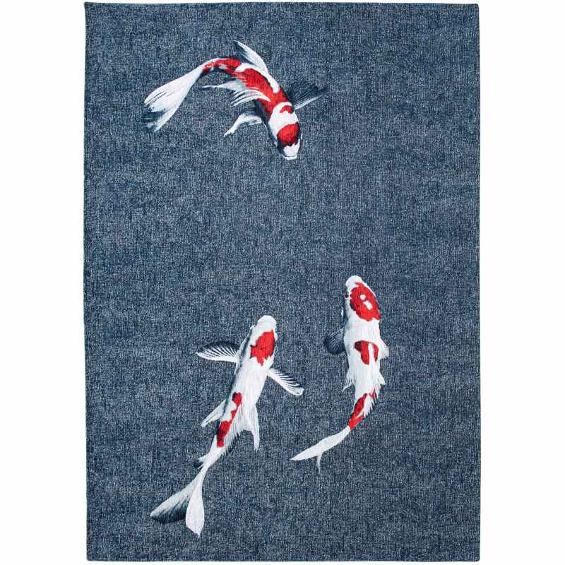 Introducing the Koi rug 9390 by Louis De Poortere from the Pop collection. This rug is quirky, adding a dose of originality to your home interior. Featuring a unique and iconic koi motif, presented in a red and white colourway on a blue ground. This rug is a real statement of style and an invitation to get off the beaten track, sure to catch the eye and spark lively conversations. This eco-friendly rug is power loomed in Belgium and fully recyclable. The 100% Polyester pile and Anti Slip backing is both durable and resilient making it a perfect choice for under tables and chairs. Choose from a large selection of rectangular sizes. Also available in matching circular sizes click here