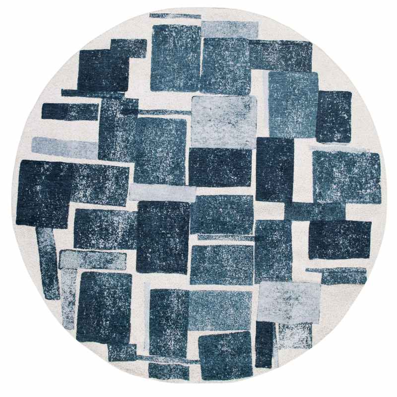 Introducing the brand new Lucia round rug 9355 by Louis De Poortere. This rug skilfully combines retro 50s elements with a trendy, contemporary aesthetic. This rug stands out for its bouclette effect, offering a soft, fluffy texture thats very much in vogue. The design concept revolves around the play of cubes and the search for balance, reminiscent of a carefully stacked house of cards. The geometric shapes are reminiscent of cubism, creating a dynamic, artistic aesthetic, presented in a ice blue colourway. The play of transparency adds a touch of depth and mystery to the whole. This eco-friendly rug is power loomed in Belgium and fully recyclable. The 100% Polyester pile and Anti Slip backing is both durable and resilient making it a perfect choice for under tables and chairs. Also available in matching rectangular sizes click here