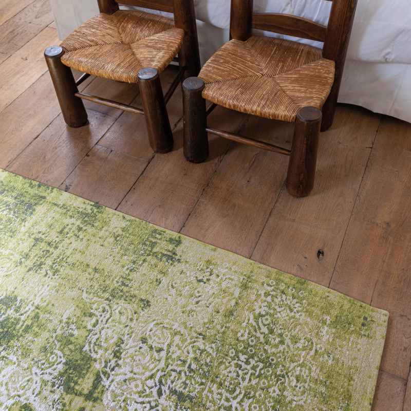 Louis De Poortere's Kirman rug 9375 is a harmonious blend of past and present, of classic deconstruction and contemporary artistic expression. Inspired by an old design, this rug adds a worn and nostalgic touch. The motif is stylised using a flamed yarn, which structures the design and gives it a textured, subtly evanescent appearance, like a memory that is slowly fading. This unique technique gives the rug a captivating, artistic aesthetic. Available in five colours, shown here in a tuscany green colourway. The 100% Polyester pile and Anti Slip backing is both durable and resilient making it a perfect choice for under tables and chairs. Choose from a large selection of rectangular sizes.
