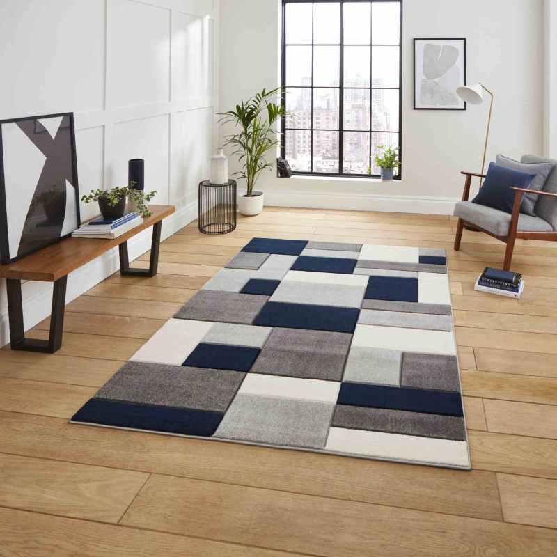 The Matrix MT61 rug will bring a wonderful modern feel into the home. This beautiful rug is made up of carved, modern, geometric designs in luxurious shades of grey and navy blue to produce a striking rug which will refresh any corner of the home in an instant, making it a perfect new addition to add to your living room, bedroom and hallway areas. Gorgeously crafted with 100% Polypropylene, this rug is durable, made to handle messes and scratches, is extremely resilient and can easily bounce back from wear and tear. Available in sizes small to large.