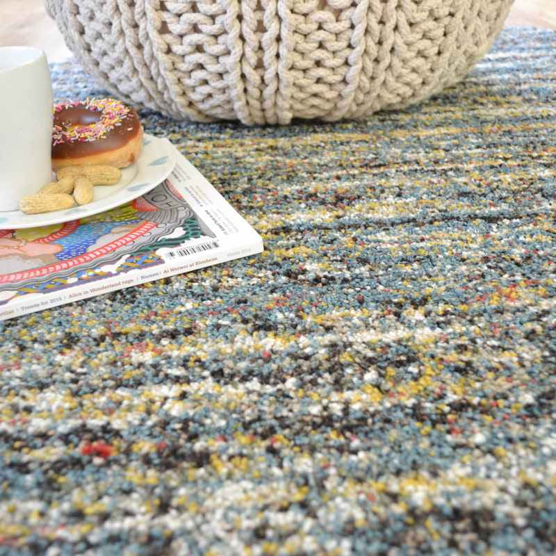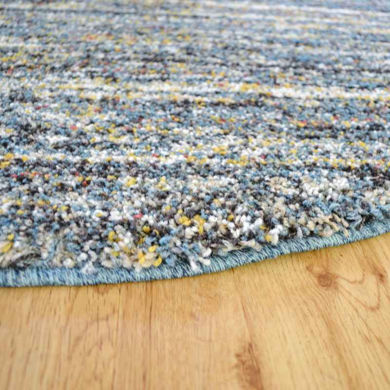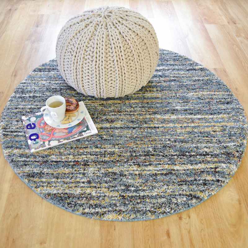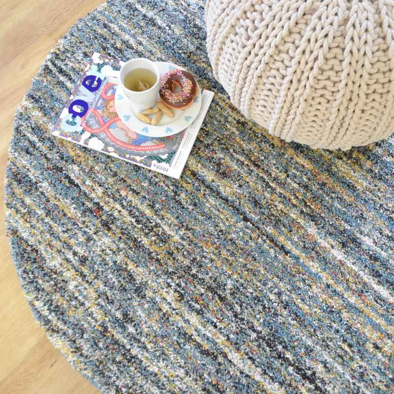 Mehari circular rugs 23067 5949 are power loomed in Belgium with a thick, soft 100% polypropylene pile in a berber style. The Mehari Rug features an abrash effect in contrasting shades of blue and benefits from being stain resistant, colourfast, water repellent and non shed. Pile height 25mm and weight of 3200g per square metre.