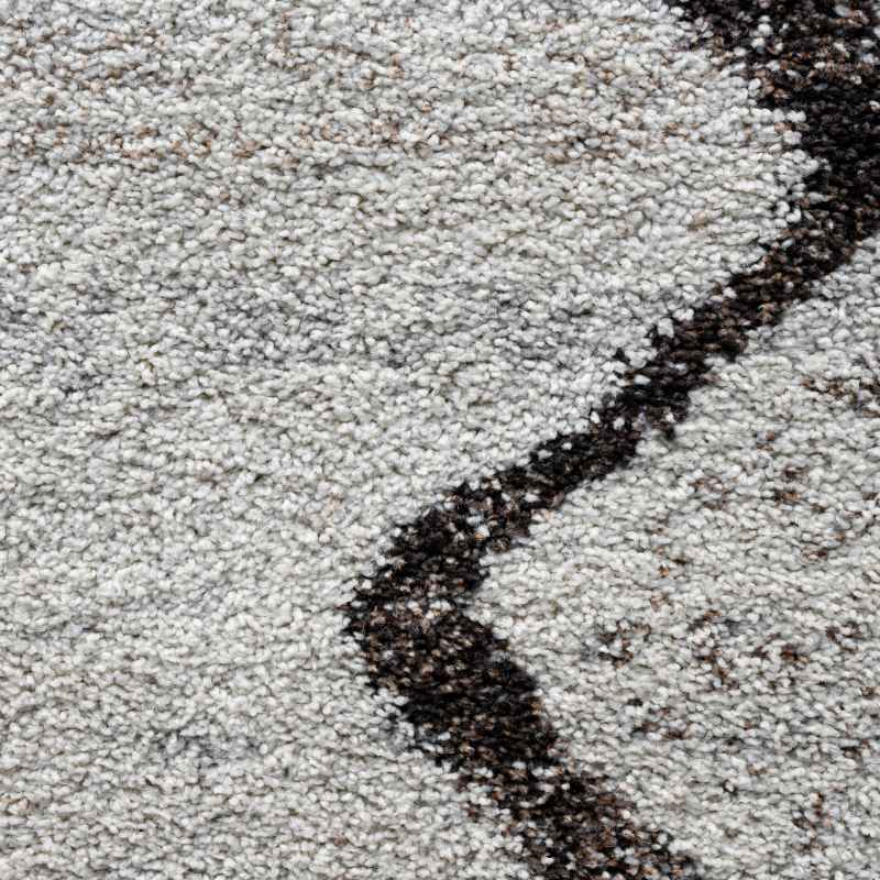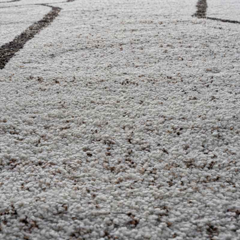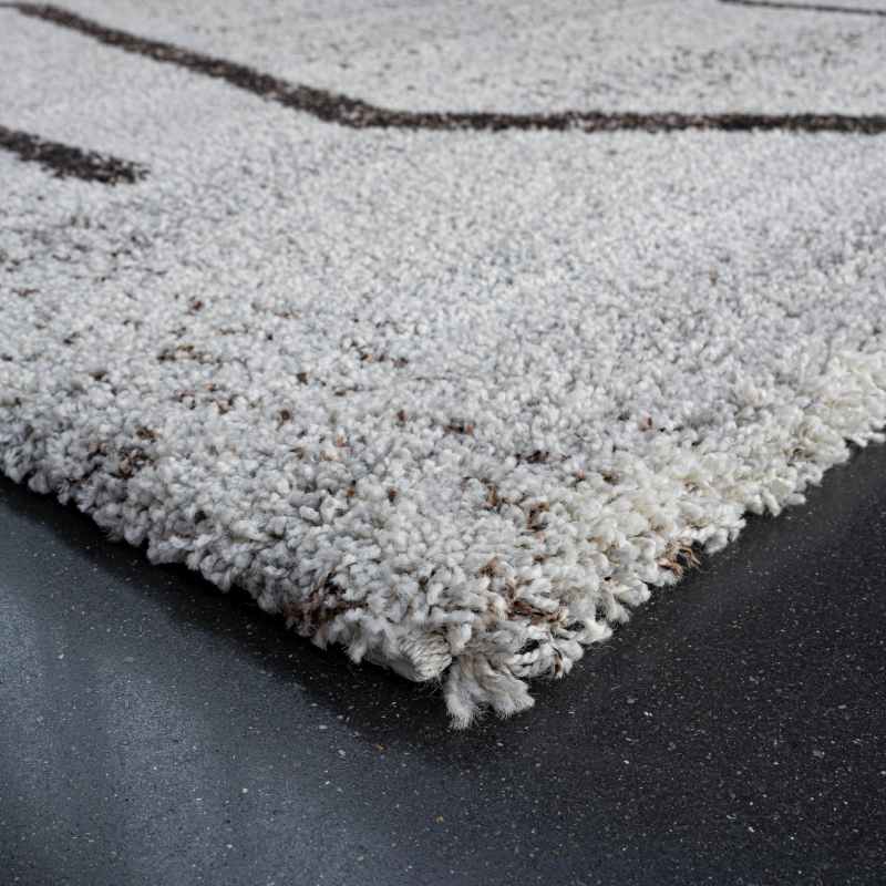 The Mehari 23411 6238 rugs feature an abstract design for a modern feel. Power loomed in Belgium with a thick, soft, shaggy pile. Crafted with 100% polypropylene which benefits from being soft to touch, stain resistant, colourfast, water repellent and anti shed. This rug is displayed in shades of brown, and charcoal on a cream white ground, bringing comfort and style to your bedroom, hallway or office areas. Pile height 25mm. Available in a wide range of sizes from small to extra large.