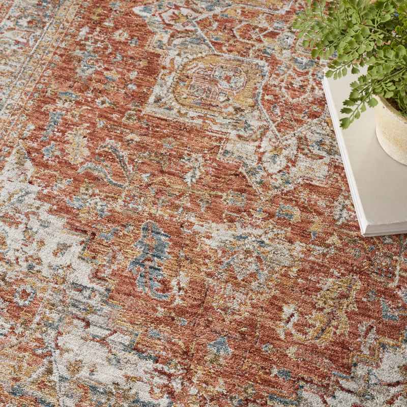 Enhance any space with this traditional rug from the Nourison Sahar collection. This traditional Persian rug features ornate, detailed patterns that are finished with purposeful distressing that adds a classic feel, finished with an ornamental border and serged edges. Designed in vibrant colours for home styling, perfect for living room and bedroom areas. Beautifully crafted with 100% polyester for a durable rug which is suitable for moderate foot traffic. This rug has a medium pile with moderate shedding. Available in a range of sizes from small to extra large. Also available in a matching runner size click here