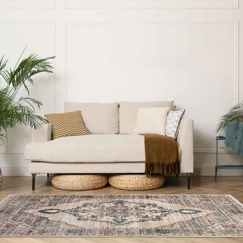 With traditional influences and striking colour tones, the Nova Leona rug is big on style, featuring a distressed medallion design, finished in multi tones on a cream white background. Bring a subtle, sophisticated feel to any interior with the timeless elegance of these traditional prints, certain to steal the spotlight. Ideal for any living space, the Nova Leona rug would be perfect placed under a table in your living room, or placed in a bedroom for a statement finish. Crafted from durable material, this piece is guaranteed to bring an eye-catching element of sophistication and elegance to your home. Composition: 100% heat set polypropylene. Available in sizes small to XXL. Also available in a matching runner click here