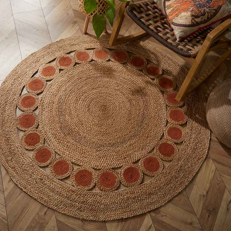 Prestwich Rugs' circular design creates a centrepiece for all contemporary design schemes. Woven from sustainably sourced jute for style that is not only great for your home but the planet too! Showcasing a braided design that adds an additional layer of beauty to this beachy rug. Shown here in shades of natural and orange.