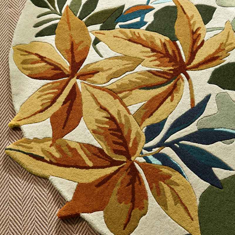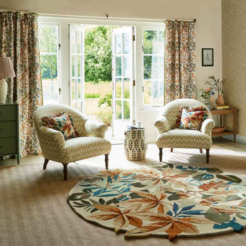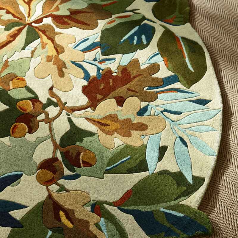 Introducing the brand new Robins Wood circle rug by Sanderson. Taking its name from Robins Wood, an area of diverse flora, fauna and ancient woodland thought to date back to after the last ice age, this all-over design of oak and sycamore leaves is inspired by an archive document. Sumptuous rich colours allude to the changing seasons, with the carved edges of the rug adding depth to the ground and exaggerating the luscious leaves within the design. Presented in a russet brown colourway. Pure new wool & viscose is used to establish a soft, heavyweight pile, that is durable, naturally stain and dirt resistant, easy to maintain, and feels luxurious underfoot. A bold statement in any home, the ingenious use of colour allows this rug to fit around most interior landscapes. A perfect new addition to add to your living room, bedroom and office areas. Also available in matching rectangular sizes click here To tie the look together pair this rug with the matching wallpaper click here