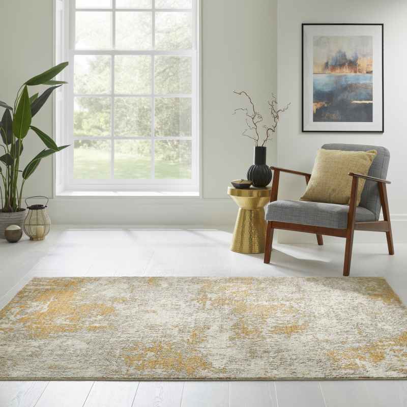 The ROS03 rug from Concept Looms features an abstract design in a distressed pile. Displayed in ivory white and and gold tones, perfect for any modern home. This rug will create a stunning focal point to your living room, hallway and bedroom areas. Beautifully crafted with 96% polypropylene 4% polyester, this rug is made to last, perfect for high traffic areas of a busy household. Available in a range of sizes from small to extra large. Also available in a matching circle rug click here