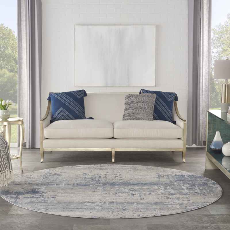 At home in a country cabin or urban loft, the Rustic Textures RUS10 collection from Nourison blends earthen tones and contemporary abstracts together in beautifully textured modern rugs that are sure to bring a rustic feel to any decor. In a ivory white and blue colourway, this circle rug is the perfect new addition to add to the living room, bedroom and hallway areas of your home. Gorgeously crafted with 51% polypropylene 49% polyester, for an extremely resilient and durable rug that is soft to touch. Available in small and medium sizes. Also available in matching standard rectangular and runner rugs. For matching standard rug click here For matching runner click here