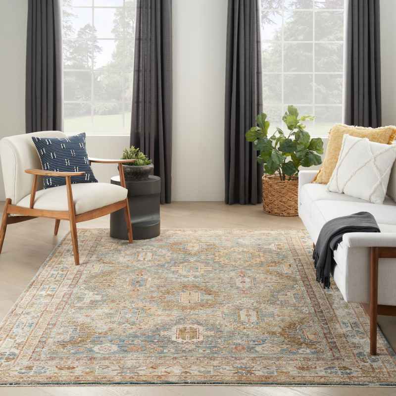 Enhance any space with the vintage-inspired designs of the Sahar SHR01 rug by Nourison. This traditional Persian rug features ornate, detailed patterns that are finished with purposeful distressing that adds a classic feel. With its ornate design in blue with neutral details, this vintage rug adds a layer of traditional style and soft comfort to your space. Place this Persian rug in your living room, dining room, bedroom, or hallway for a warm and welcoming accent, recommended for areas with moderate foot traffic. Machine-made from 100% polyester fibers that are soft to the touch, easy to clean and maintain, and comfortable underfoot. Moderate shedding. Available in an array of sizes from small to extra large. Also available in a matching runner. For matching runner click here