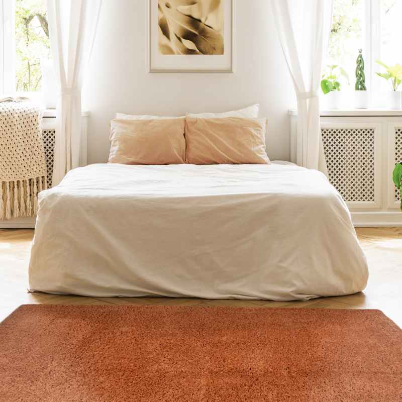 Time to get cosy with the Snug Plain rug. Perfect for bringing some cosy texture, this shaggy rug is luxuriously soft underfoot, and the ideal piece for bedroom and living room areas. Featuring a modern plain design, in a terracotta orange colourway. Machine woven in Belgium, made from 100% polyester with a jute backing for a durable, easy to clean rug. Simply spot clean with surface shampoo to banish spills and stains. Use of an anti-slip rug grip is recommended on hard flooring to prevent slippage. Pile height: 3cm. Available in sizes small to extra large. Also available in matching runners click here