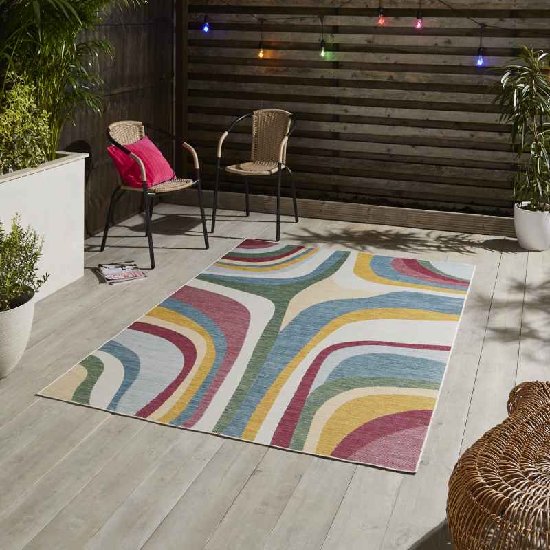 Add a touch of colour to your outdoor area with the Spectrum E9333 rug. Made from high-quality polypropylene with a flat weave construction for a sleek and modern look that is stain resistant and hard-wearing. Featuring an abstract design in shades of green, blue, pink and yellow. The super durable construction and easy-clean design makes this rug perfect for outdoor use, ensuring it can withstand the elements and retain its shape and texture over time. Whether you're looking to add a cozy touch to your patio, deck, or outdoor living space, the Spectrum rug is the perfect choice. Available in sizes medium to extra large.