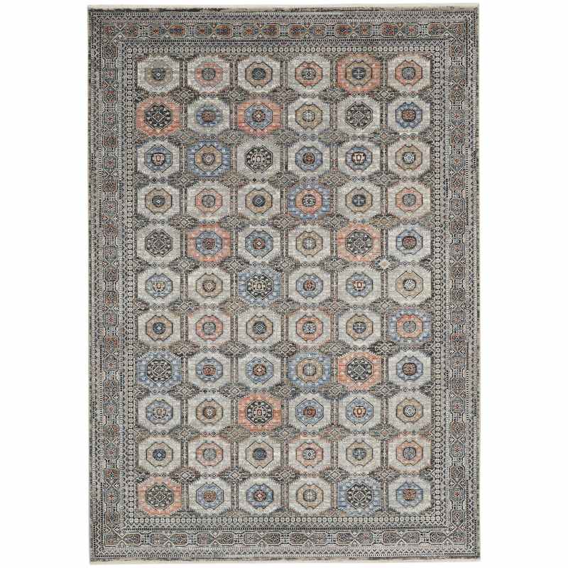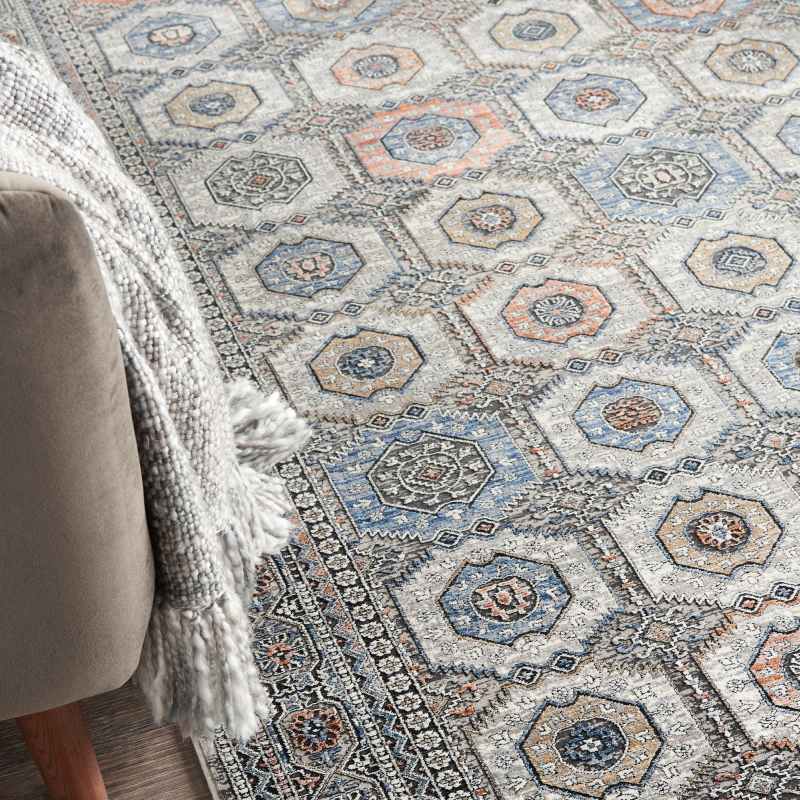 Harkening back to old-world, Persian opulence from centuries ago, the new Starry Nights collection features traditional area rugs with vintage allure. Featuring an elaborate design on a traditional, framed pattern with faded patina for a vintage look. Faded grey and navy threads blend seamlessly on this versatile, Persian style area rug. Silky to the touch and pleasing to the eye, with a soft, inviting pile. Its palette of soft colours is gently faded for a distressed vintage look that adds warmth and subtle sheen to a favourite bedroom, living room, family room or other gathering space. Available in a range of sizes. Made from 80% Luxcelle, 20% Shrink Acrylic.