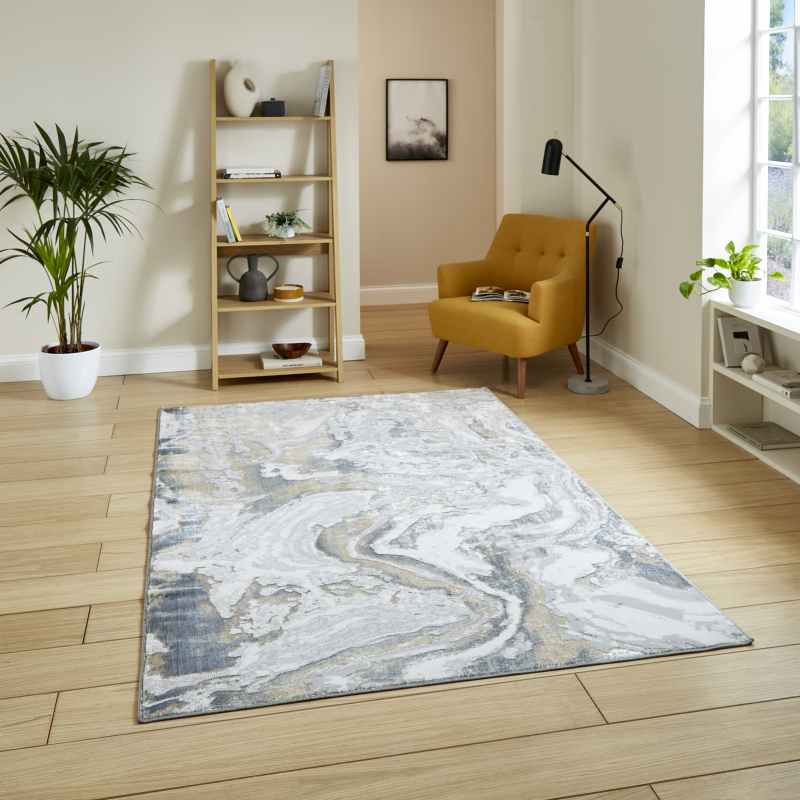 The Tidal TL837 rug presents a gorgeous abstract marble design in a metallic effect yarn, working wonderfully with any interior for opulent style. The contemporary styling of the Tidal rug looks sensational as a centrepiece in the living room as well as bedroom and office areas. Displayed in a silver grey and beige colourway, this rug has a multi textured pile for a modern finish. Crafted with polyester, this rug is stain resistant and durable. Available in sizes small to extra large. Pile height: 1cm. Machine made before being cut out and finished by hand.