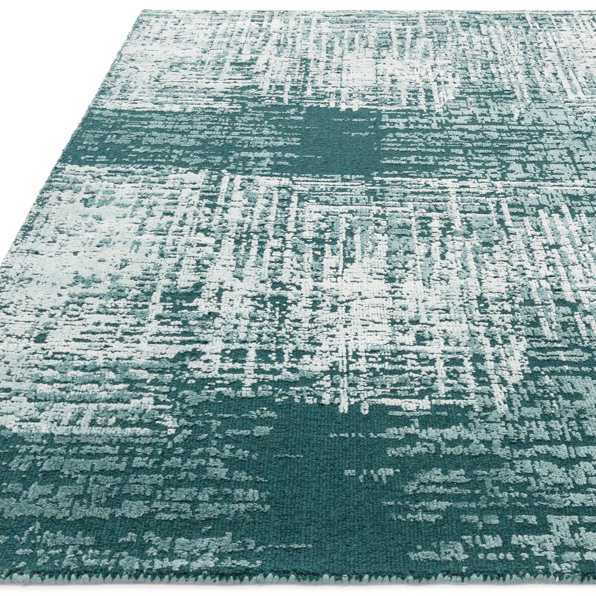 Torino is an exciting and premium rug, featuring a striking abstract and textural design, in a teal green colour palette. This luxury rug is machine tufted in a cut pile viscose with intricate wool loop detailing, creating a sumptuous high low finish. This rug will make a statement whether positioned in the hallway, living room, or bedroom and is a great addition to any modern home. The 50% wool 50% viscose material composition means the softness of this rug will delight bare feet as they step across its surface, lending an air of elegance to any room the rug is presented in. Available in a range of sizes from small to large.