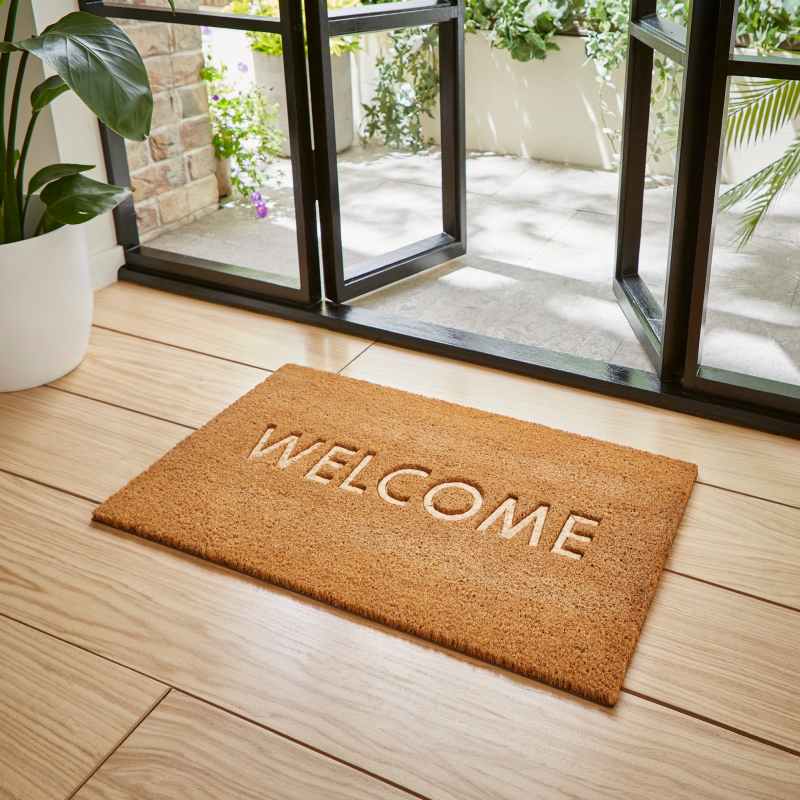 The Welcome Embossed Doormat has been crafted from coir, embodying simplicity and durability. Machine tufted for precision, offering a robust and reliable solution for keeping any entryway clean. This coir doormat will provide a warm and inviting welcome, making it a timeless addition to any homes décor. This doormat will withstand daily wear and tear, ensuring long-lasting performance. Coir is much-loved for its durability as well as its unbeatable dirt trapping ability. Suitable for both indoor and outdoor use, weather resistant when placed in a sheltered position.