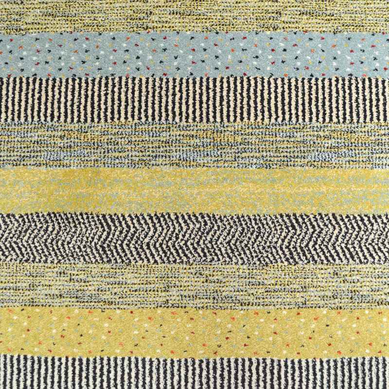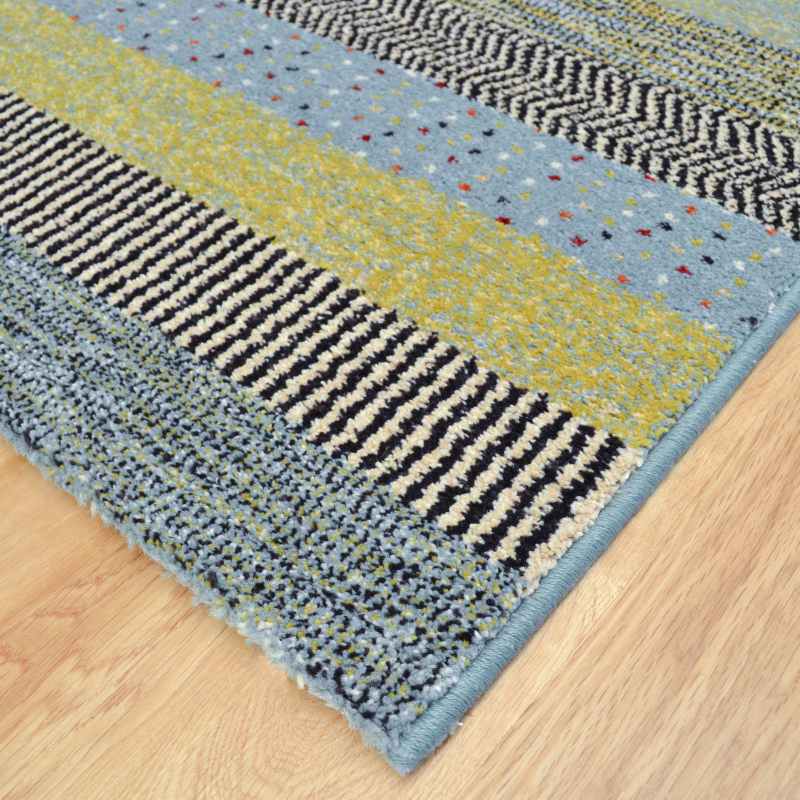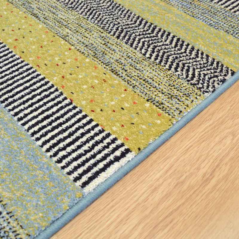 Woodstock 32743 5342 rugs are machine woven in Belgium with a luxurious, heatset, twisted Polypropylene pile. Featuring bold patterned stripes in green and blue, the woodstock rug benefits from being colourfast, water repellant, anti shed and easy to clean. A pile height of 9mm and weight of 2350g per square metre.