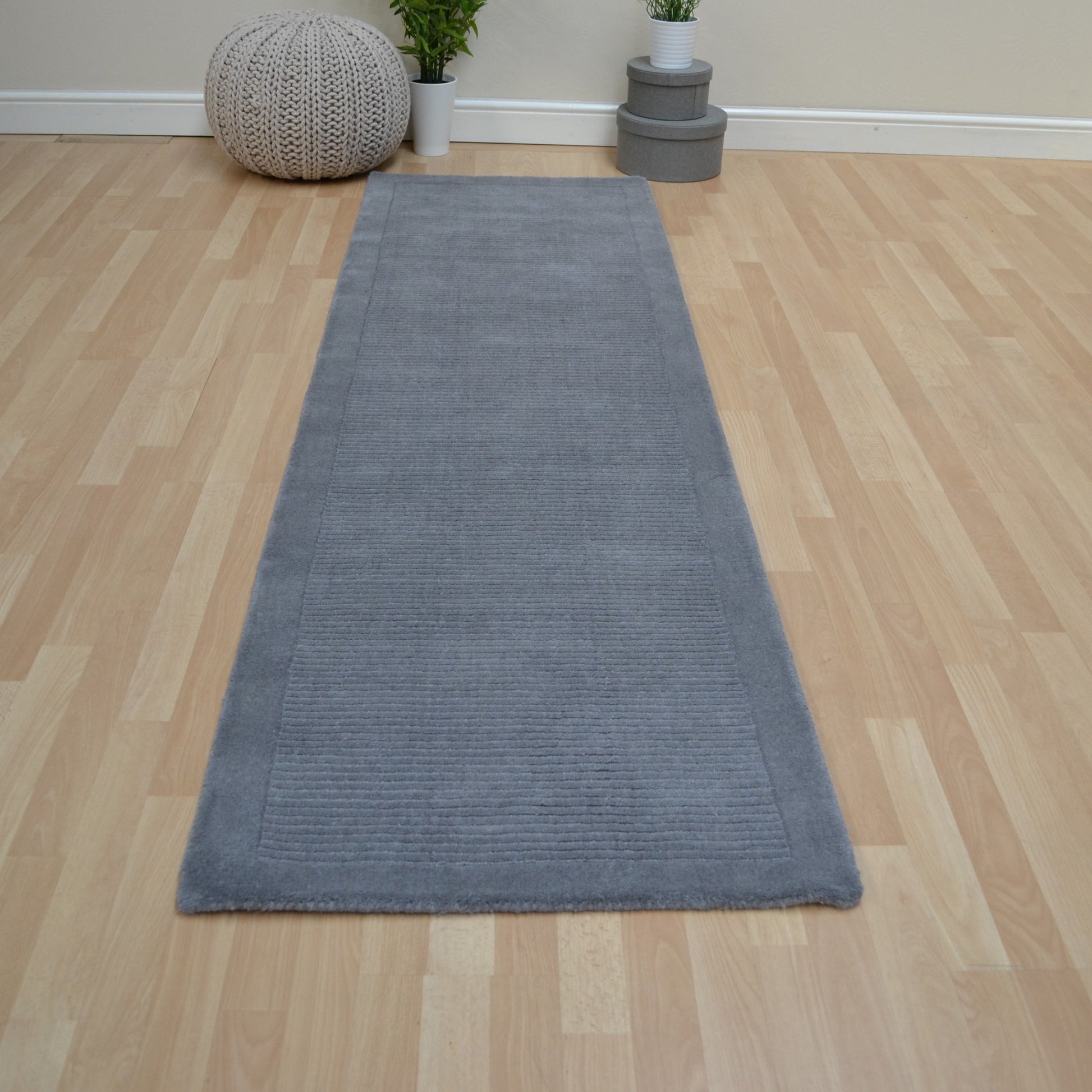York hall runners are hand loomed in India with a deep, soft, 100% wool pile. This stylish plain collection features a plain border and a sophisticated textured centre. With modern interiors featuring a vast selection of patterns in curtains and fabrics, plain runners are often the key to complementing surroundings in your home. Available in a large range of colour palettes, shown here in grey. This runner comes in one size, with custom made sizes also available. For matching standard rectangular sizes click here