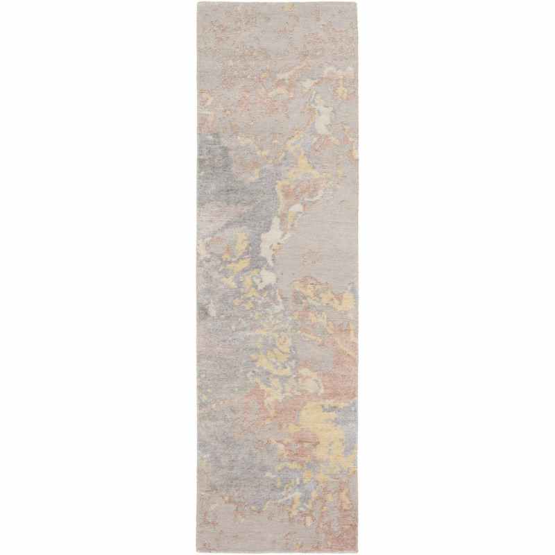 In a gorgeous interpretation of modern impressionist design, this Silk Shadows runner presents an abstract free-form design in dramatic shades of grey, gold, brown, and ivory. Hand-knotted from a premium blend of New Zealand wool and silk-like bamboo fibers, velvety soft with a subtle yet luminous sheen. Featuring carved accents that add a subtle layer of dimension and depth to any space. This luxurious runner has a medium pile height, recommended for areas with moderate foot traffic. Vacuum regularly (no beater bar), immediately spot clean with damp cloth, professional cleaning recommended. Also available in matching rectangular sizes click here